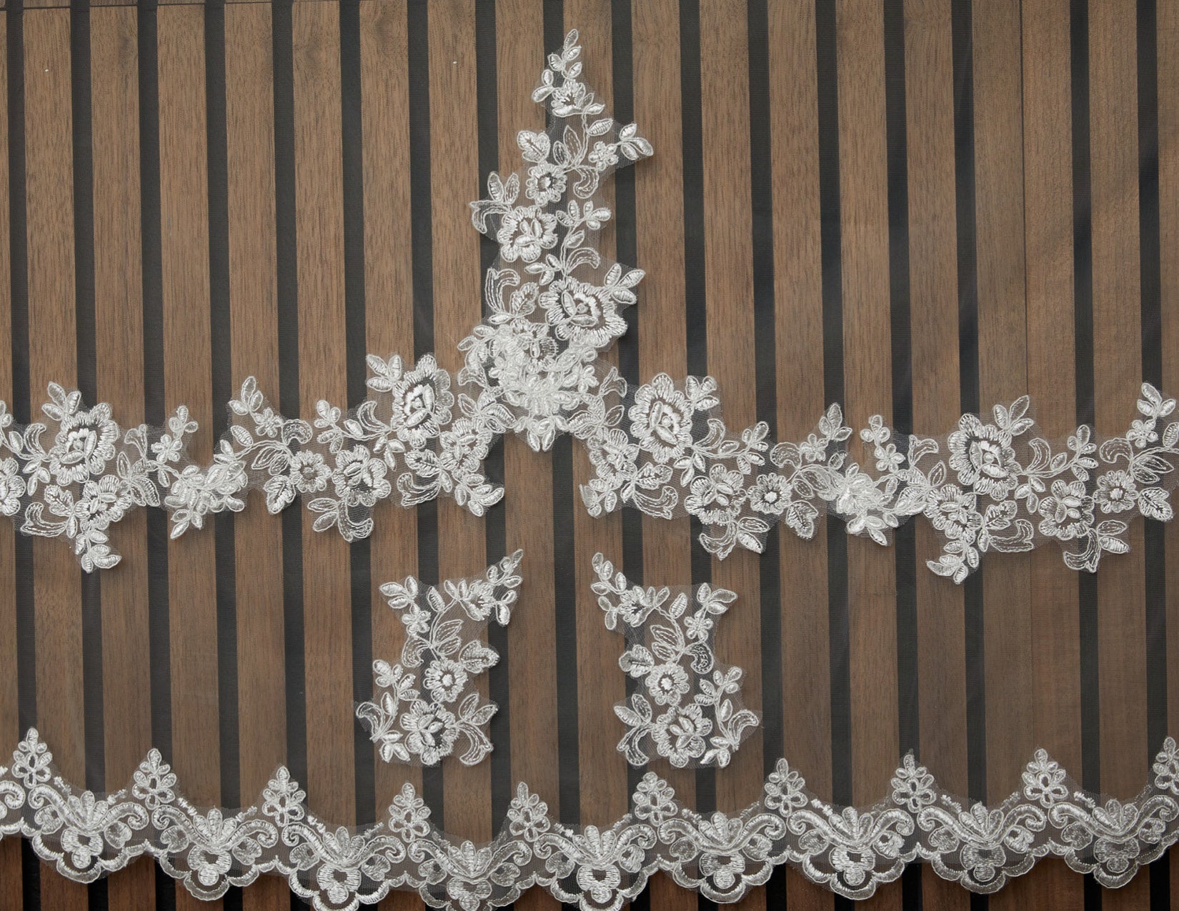 Scalloped veil (5 scallops) with cut out floral lace with beads, sequins, pearls and rhinestones. Lace starts 18” down.