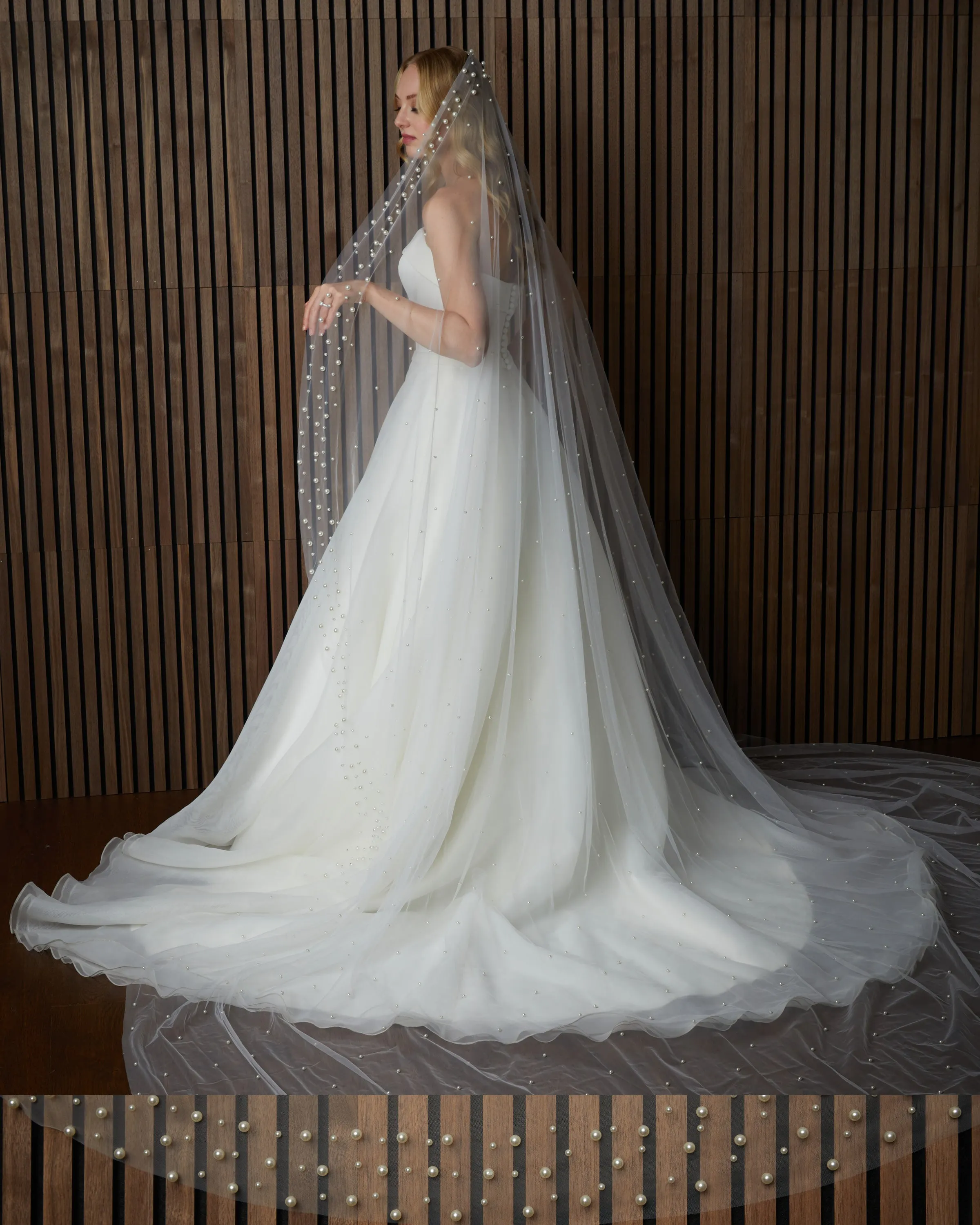 Scattered pearl border on silky tulle sewn flat to metal comb