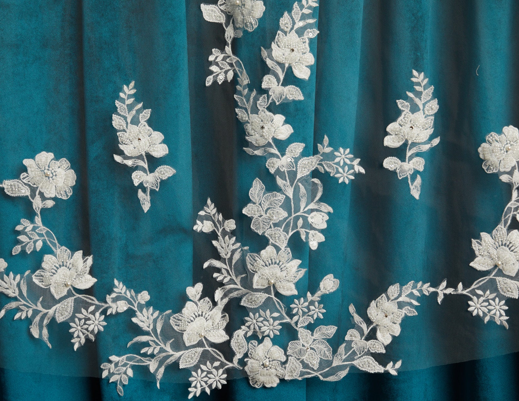 3D flower lace with sequin beaded leaves. Lace starts 42” down.