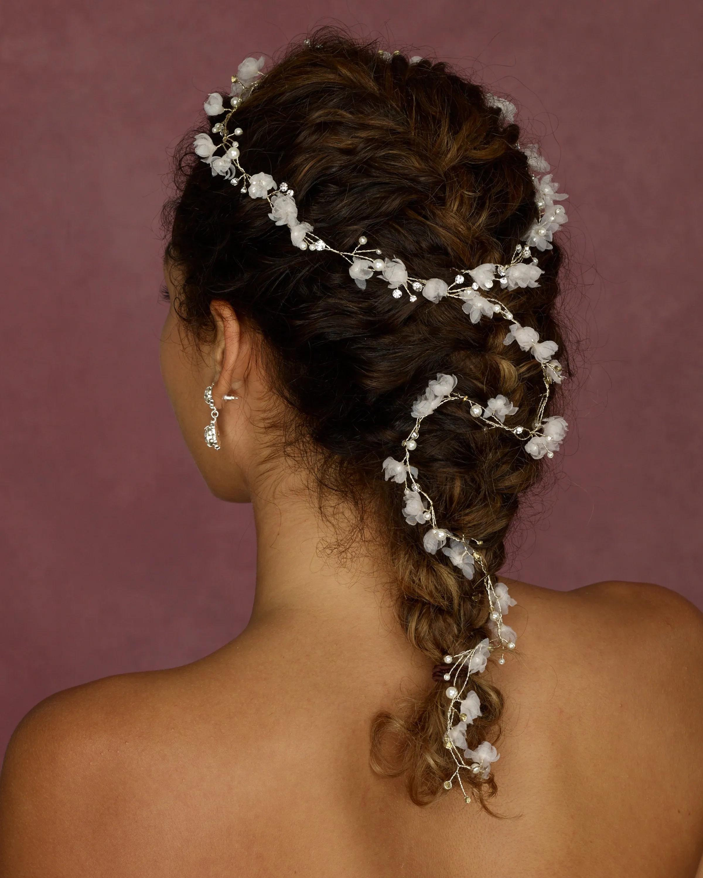 Long hair vine with pearls, rhinestones and organza flowers. Available silver with ivory flowers, silver with rum pink flowers, gold with ivory flowers, gold with rum pink flowers.