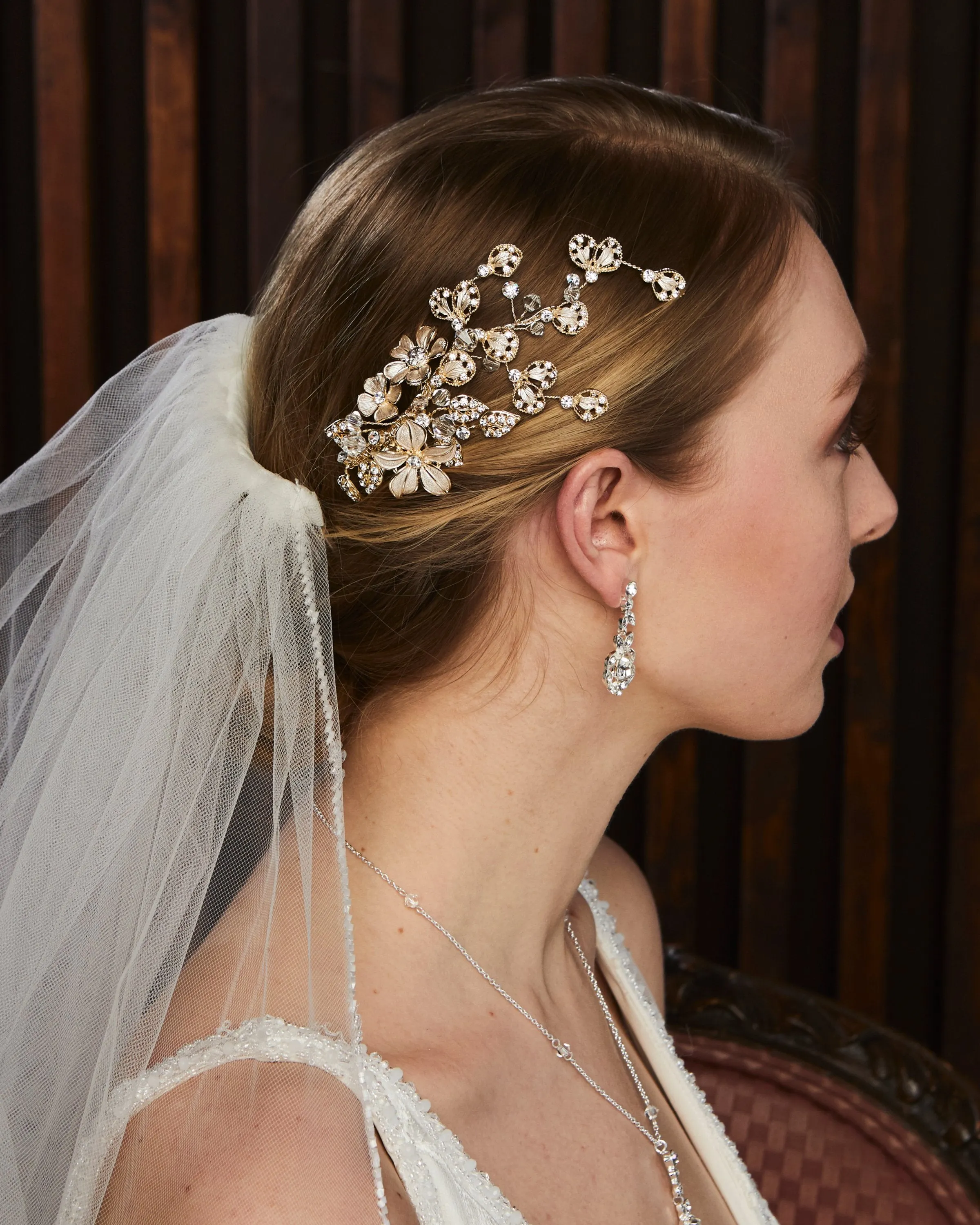 Handcrafted using rhinestones, pearls, beads, cast metal components, crystals, and other fine finishes, our headpieces are designed to bring timeless beauty and refined sparkle to a bride’s look. Each piece is silver or gold plated to ensure longevity, durability, and lasting quality.