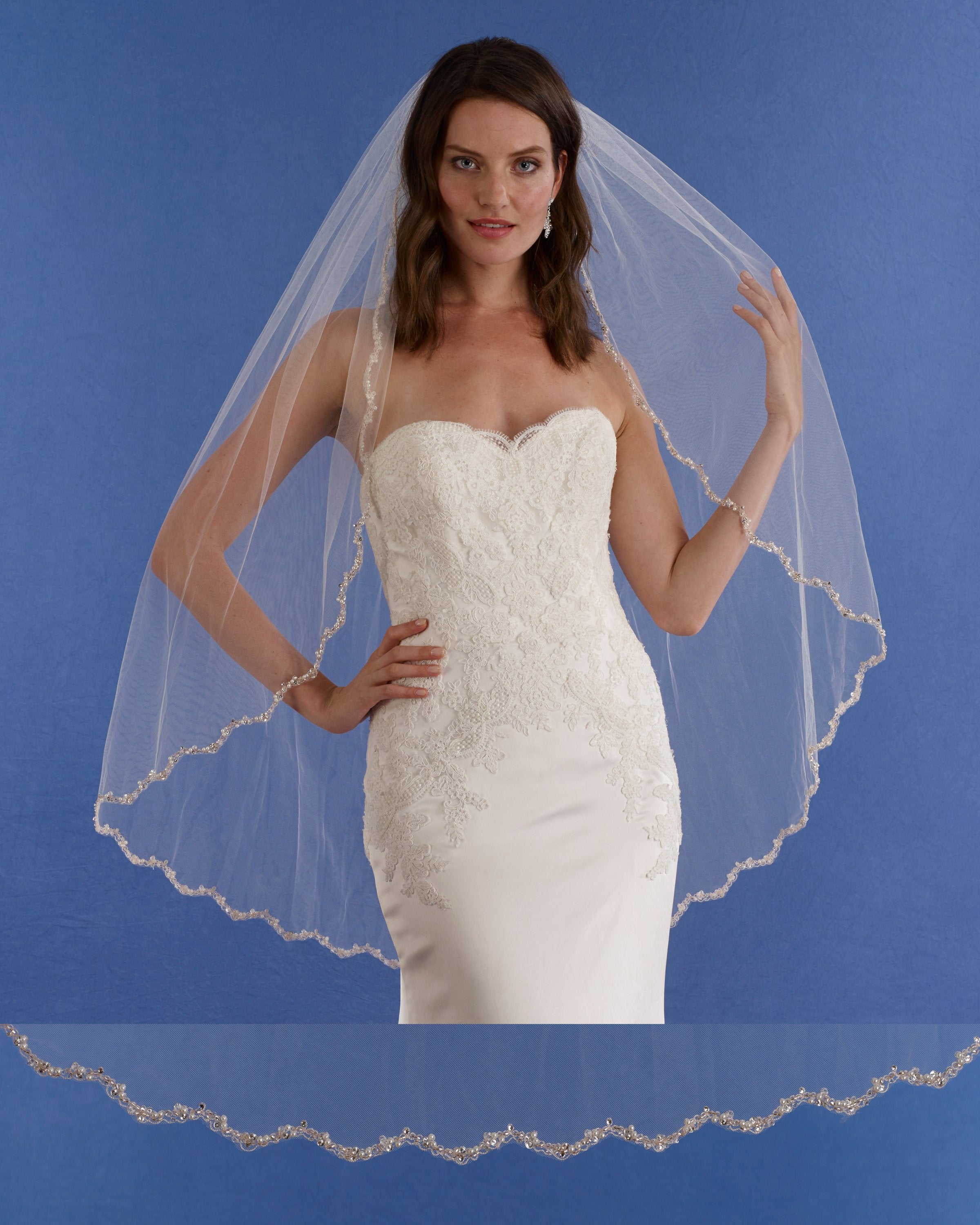 Angel cut beaded edge veil with pearls and crystals. Available in ivory/pink or ivory/ivory